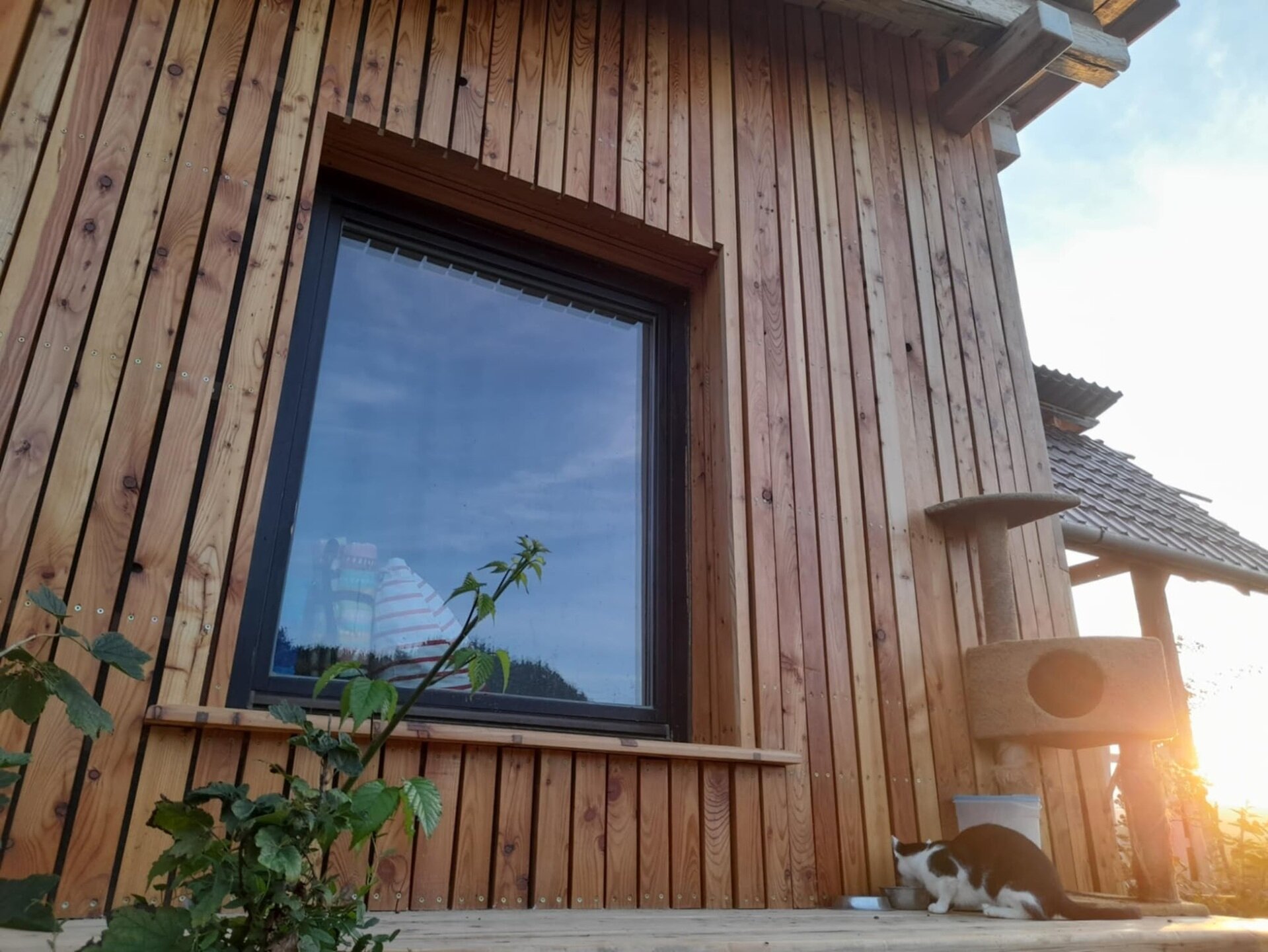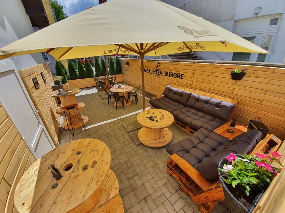Drevený obklad stien na terase pizzérie a paletové sedenie
