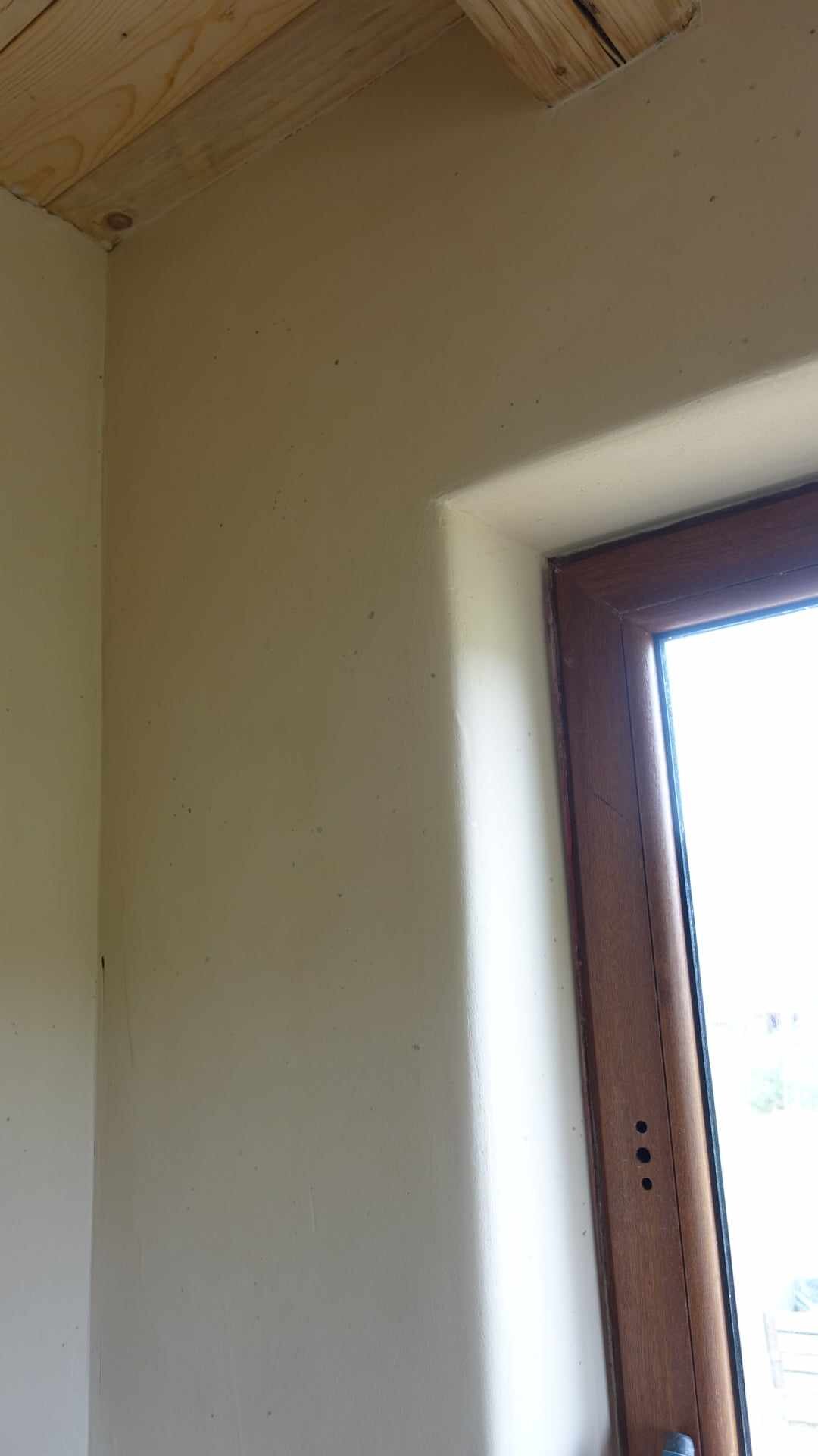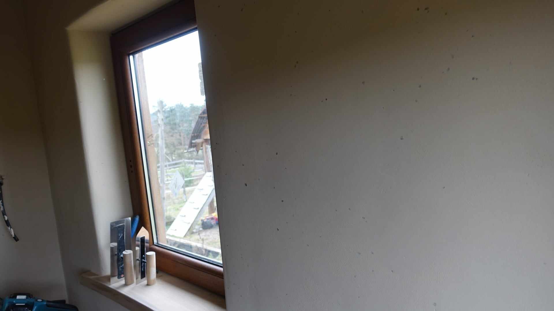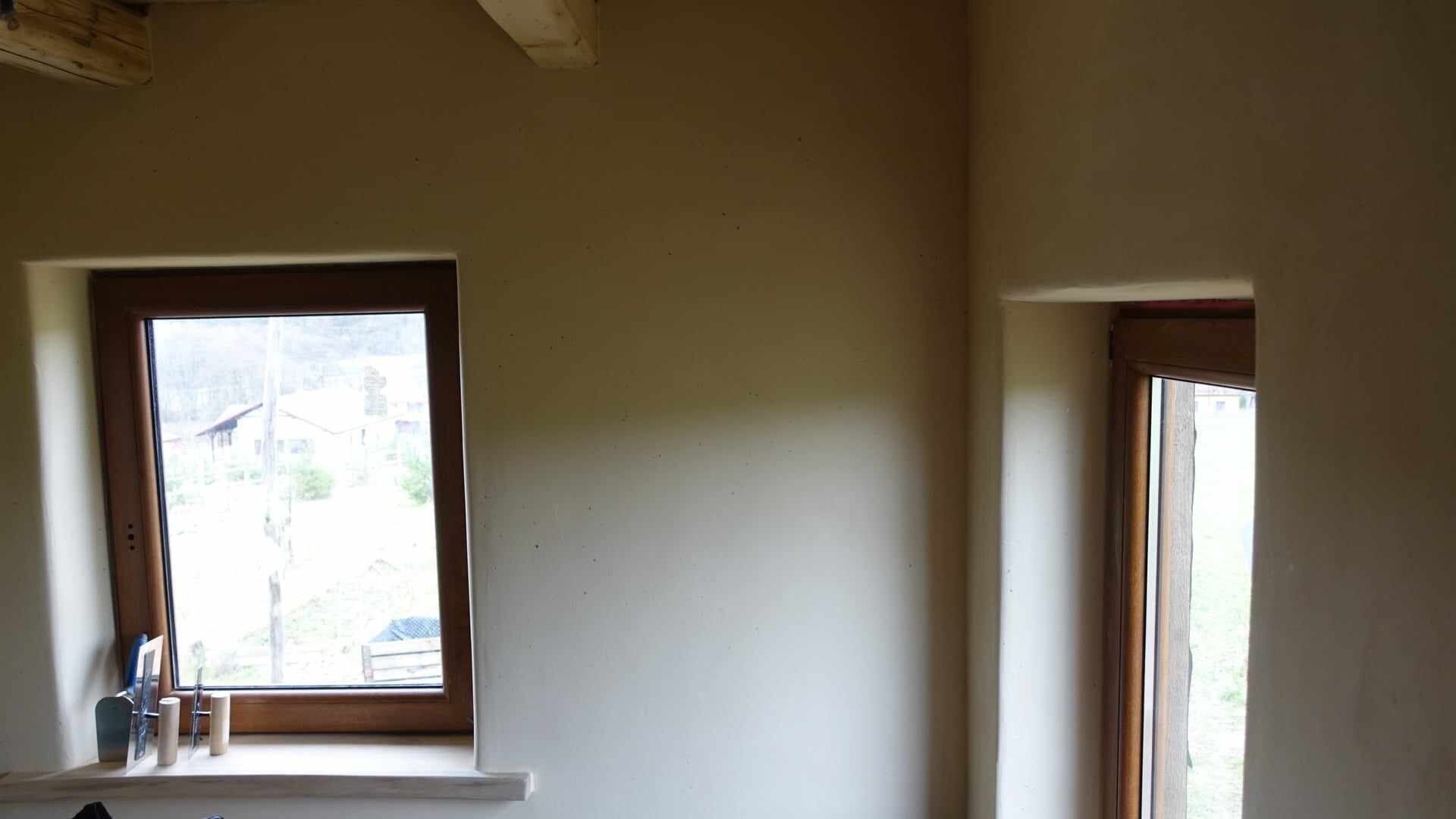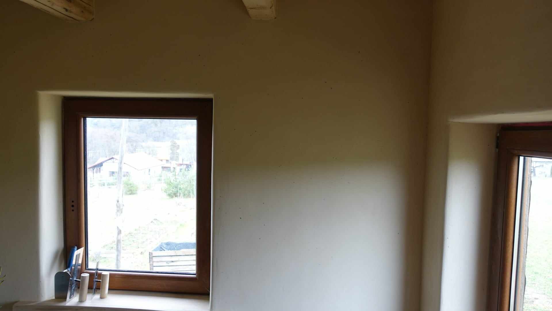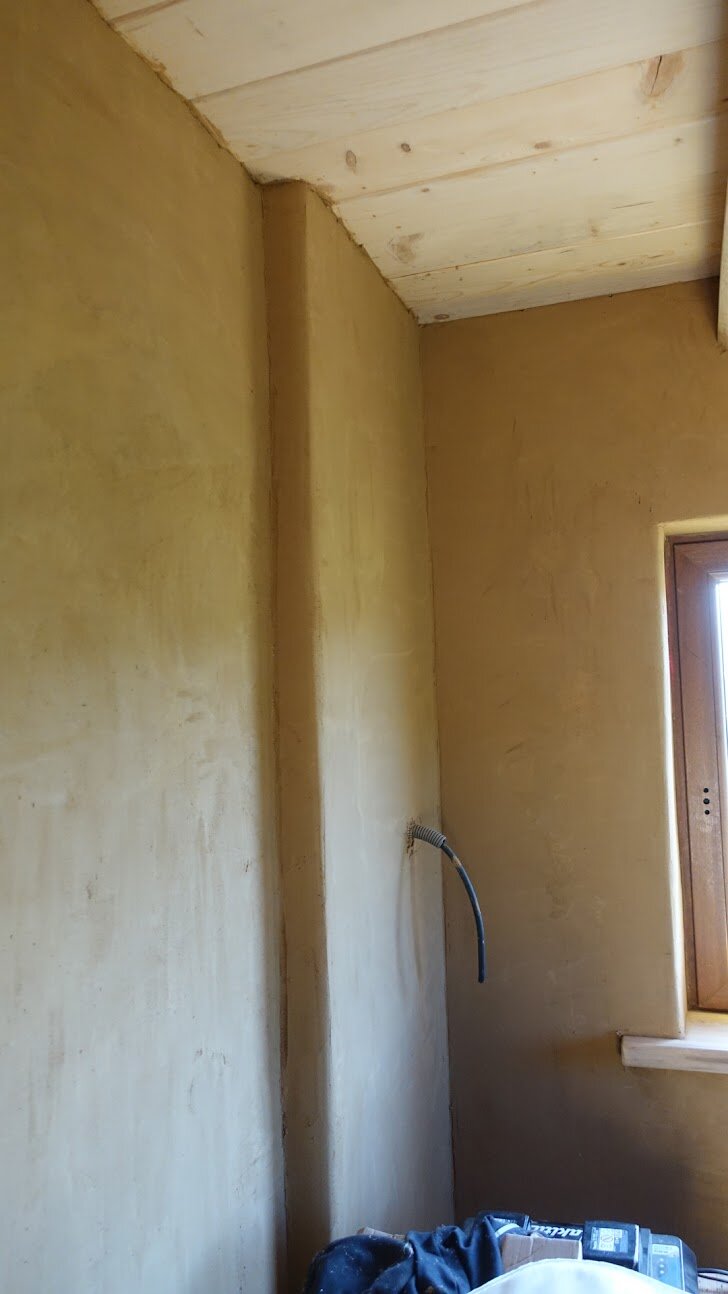 Hlinené omietky do detskej izby. Materiál na hrubú hlinenú omietku - použitý lokálny materiál z miesta, kde tento tiny house stojí. Podkladom v tomto dome je slamená stena zo slamených balíkov, v niektorých izbách je podkladom sadrokartón a osb doska, kde je nosičom omietky rákos. Ako finálna omietka je použitá jemná hlinená omietka od ARTERRE, vo farbe biela s pigmentom Siena + dekoratívna prísada priehľadná sľuda.